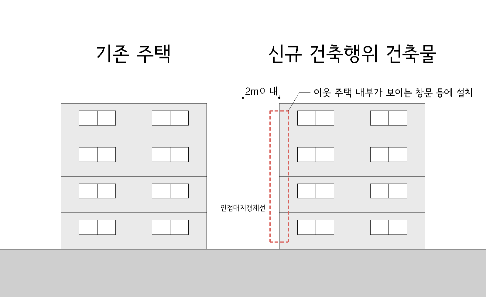 제55조(창문 등의 차면시설) 인접 대지경계선으로부터 직선거리 2미터 이내에 이웃 주택의 내부가 보이는 창문 등을 설치하는 경우에는 차면시설(遮面施設)을 설치하여야 한다.