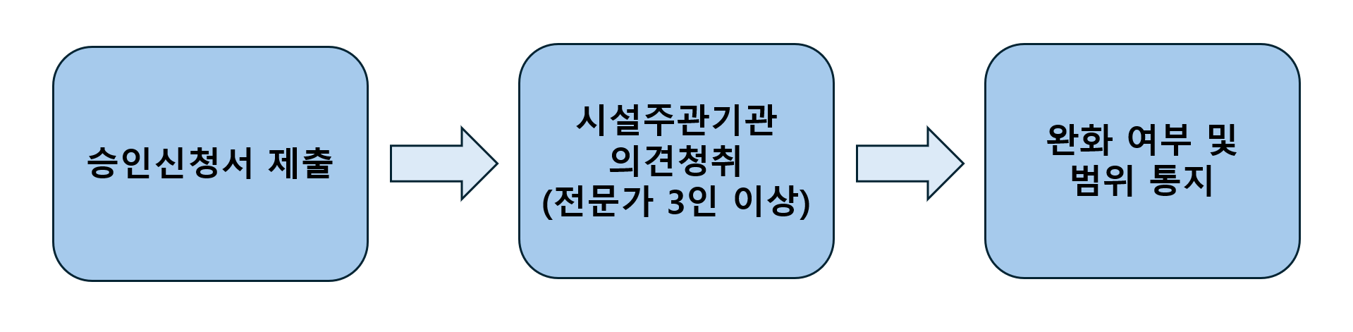 제5조(완화된 세부기준의 승인신청) 법 제15조제1항 및 영 제7조제2항에 따라 완화된 세부기준의 승인을 받으려는 자는 별지 제1호의2서식의 승인신청서에 다음 각 호의 서류 및 도서를 첨부하여 시설주관기관에 제출해야 한다. <개정 2022. 7. 26.>
