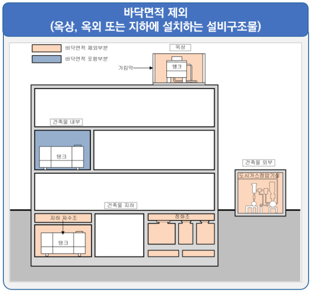 따라서, 물탱크를 설치하기 위해 옥상에 건축물의 형태(지붕과 기둥 또는 벽이 있는 것)로 설치한 구조물의 수평투영면적이 해당 건축물의 건축면적의 8분의 1을 초과하여 「건축법 시행령」 제119조제1항제9호에 따라 해당 건축물의 층수에 포함된 경우, 이 구조물 안에 물탱크를 설치하고 물탱크실로만 사용한다면, 이 구조물은 「건축법 시행령」 제119조제1항제3호에 따라 물탱크를 설치하기 위한 구조물로서 바닥면적의 산입에서 제외됩니다.
