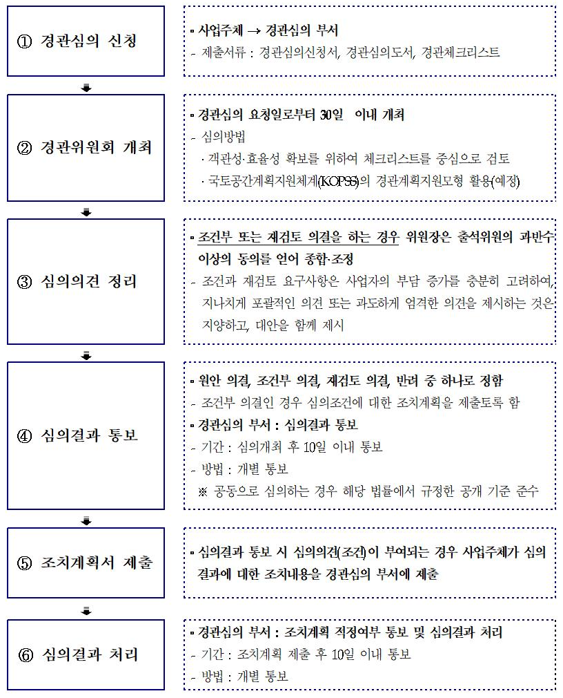 | ▫사업주체 → 경관심의 부서 - 제출서류 : 경관심의신청서, 경관심의도서, 경관체크리스트 |