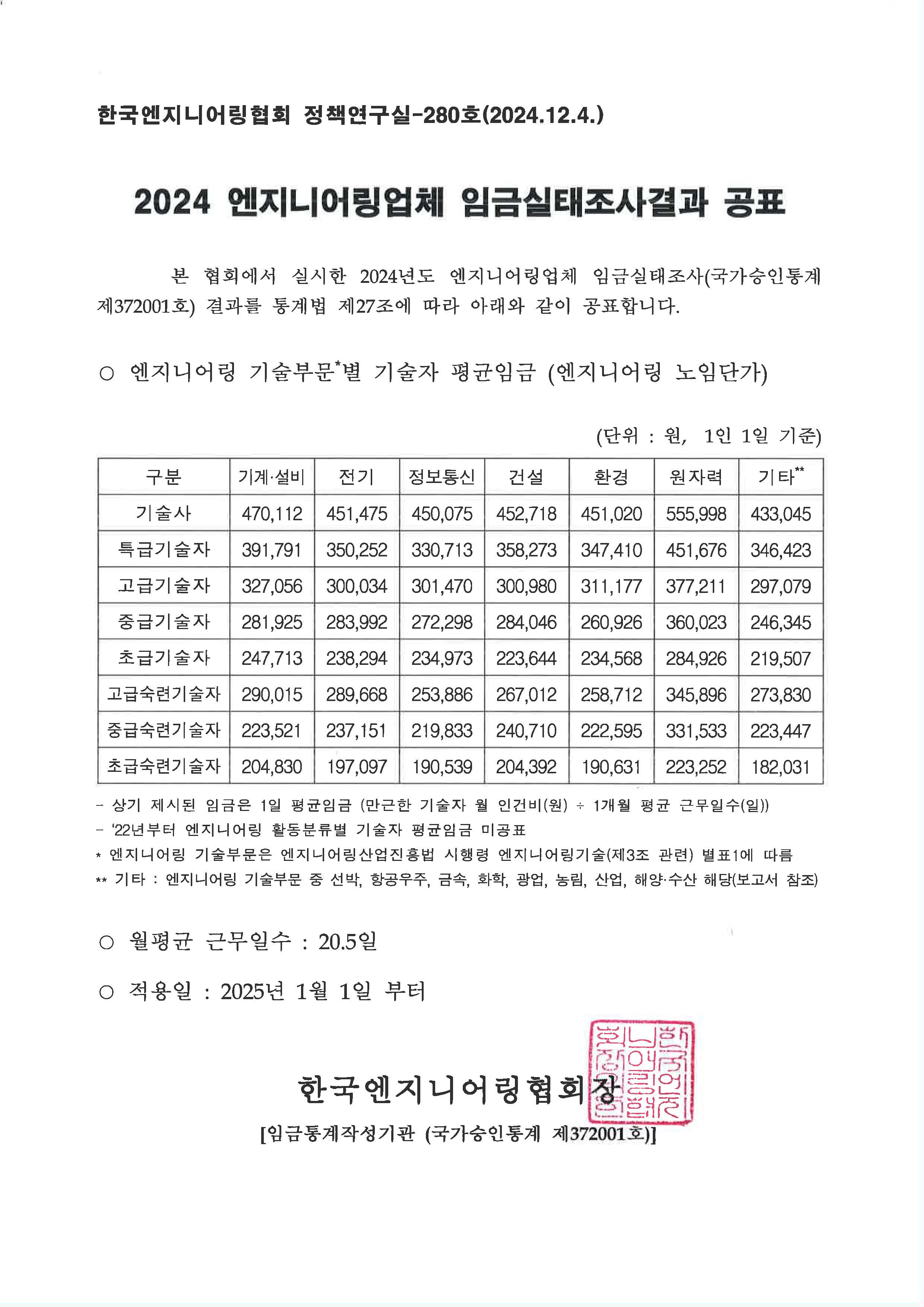 1. 한국엔지니어링 협회에서 공표하는 임금실태조사결과 인용