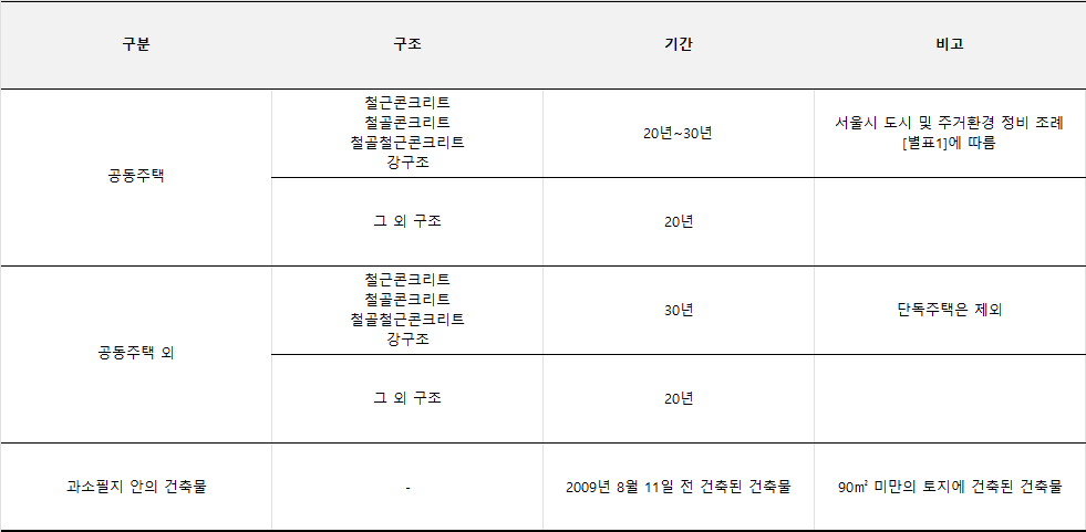 가. 철근콘크리트ㆍ철골콘크리트ㆍ철골철근콘크리트 및 강구조 건축물(「건축법 시행령」 별표 1 제1호에 따른 단독주택을 제외한다): 30년