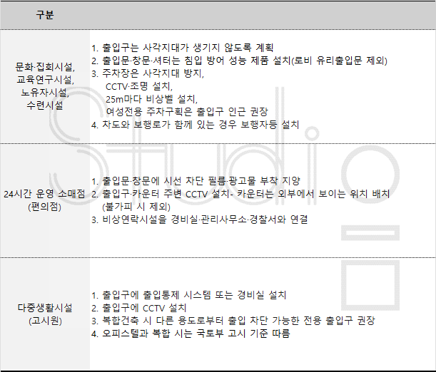 범죄예방 공통 기준 (CPTED) 요약1. 범죄예방 대상 시설이 공통으로 적용해야 하는 항목 a) 접근통제 b) 영역성 확보 c) 활동의 활성화 d) 조경 e) 조명 f) CCTV 2. 용도별 세부 항목은 아래 링크 참조 http