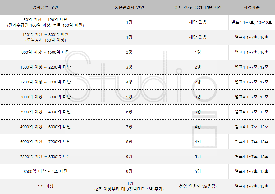 | 공사금액 8,500억원 이상 1조원 미만 | 10명 이상. 다만, 전체 공사기간 중 전ㆍ후 15에 해당하는 기간은 5명 이상으로 한다. | ||