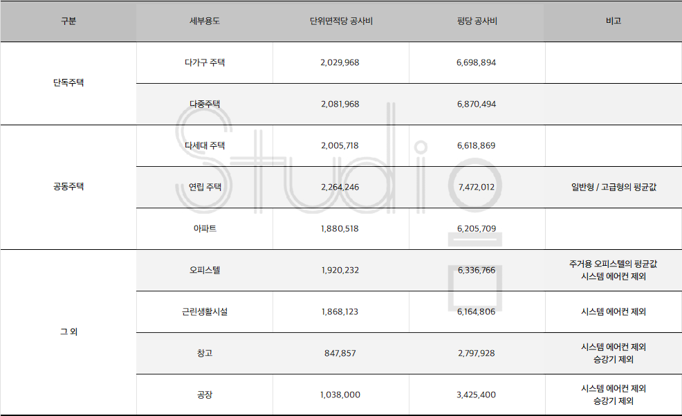 | 구분 | 단위면적당 공사비 | 평당 공사비 | 비고 | |