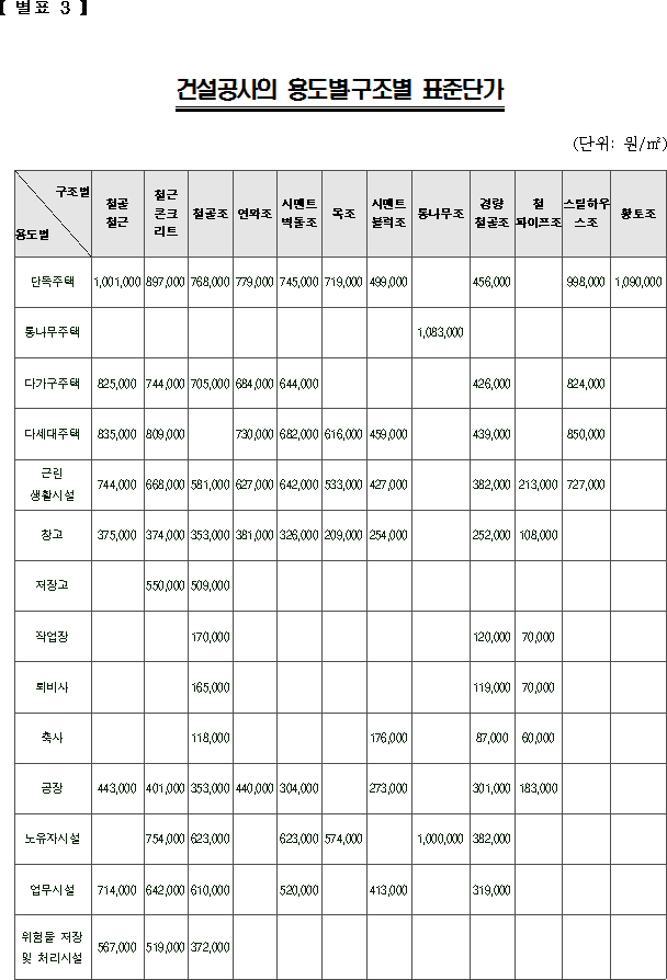 【 별표 3 】건설공사의 용도별․구조별 표준단가