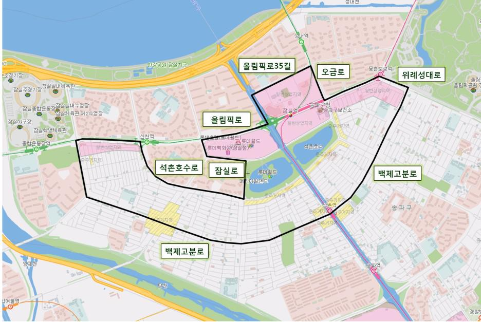 마. 잠실지역: 올림픽로·석촌호수로·삼학사로·잠실로·올림픽로·송파대로·신천로·오금로·올림픽로·위례성대로·백제고분로를 연결한 내부지역과 그 경계도로에 직접 접하고 있는 대지