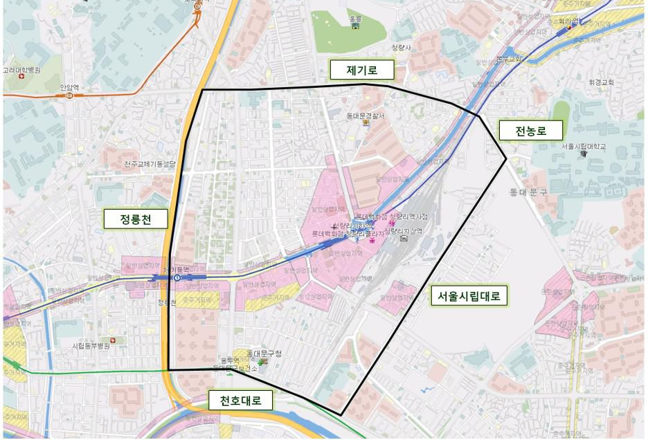 사. 청량리지역: 제기로·전농로·서울시립대로·천호대로·정릉천을 연결한 내부지역과 그 경계도로에 직접 접하고 있는 대지