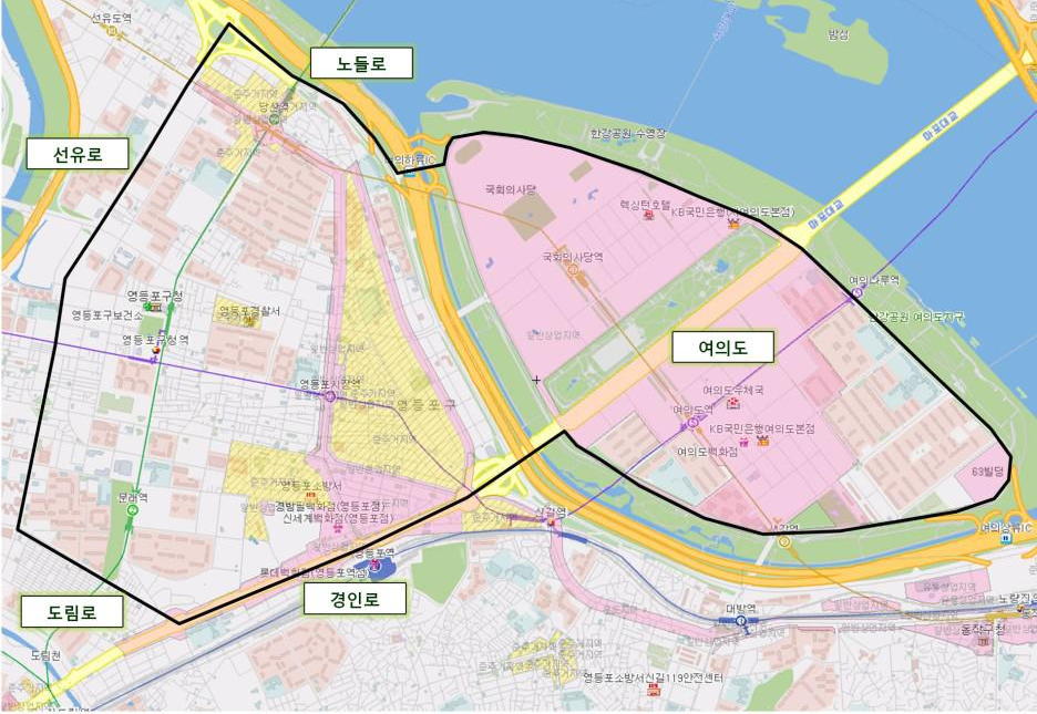 다. 영등포지역: 여의도 및 경인로·도림로·선유로·노들로를 연결한 내부지역과 그 경계도로에 직접 접하고 있는 대지