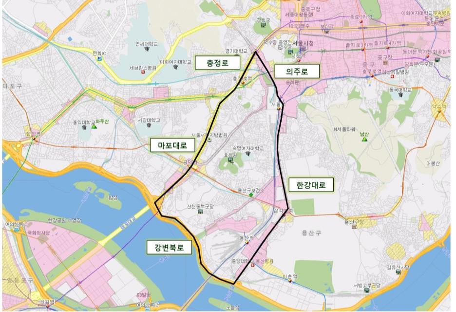 아. 용산·마포지역: 강변북로·마포대로·충정로·통일로·한강대로를 연결한 내부지역과 그 경계도로에 직접 접하고 있는 대지