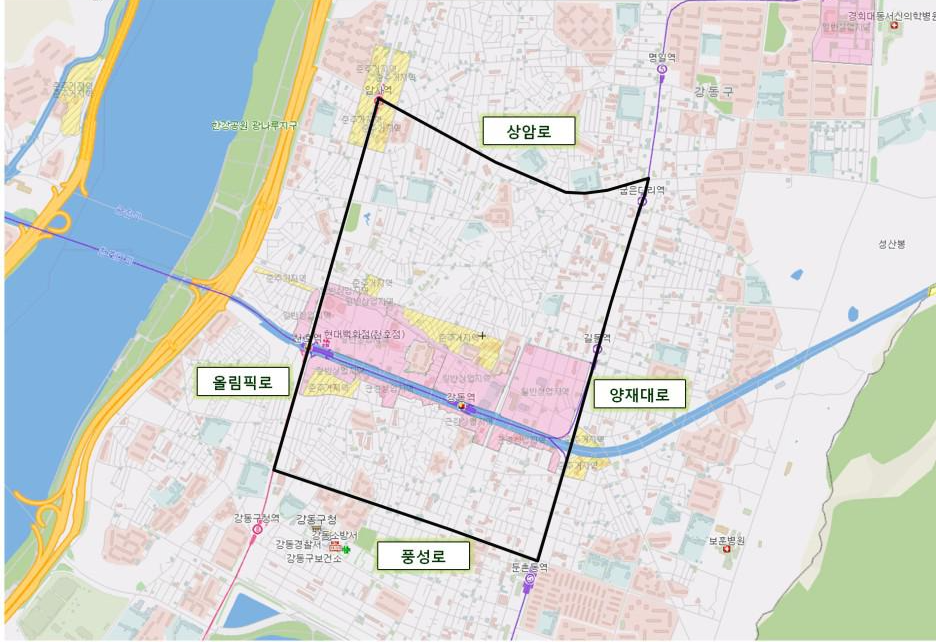 바. 천호지역: 올림픽로·상암로·양재대로·풍성로를 연결한 내부지역과 그 경계도로에 직접 접하고 있는 대지