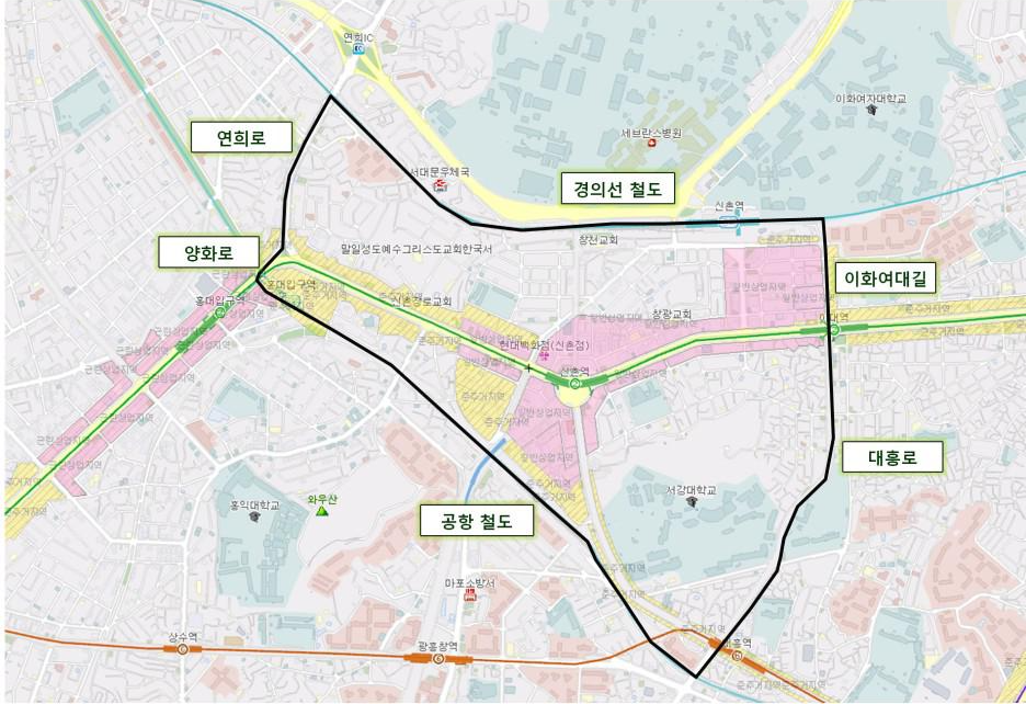 나. 신촌지역: 경의선철도·이화여대길·대흥로·구 용산선철도·양화로·연희로를 연결한 내부지역과 그 경계도로에 직접 접하고 있는 대지