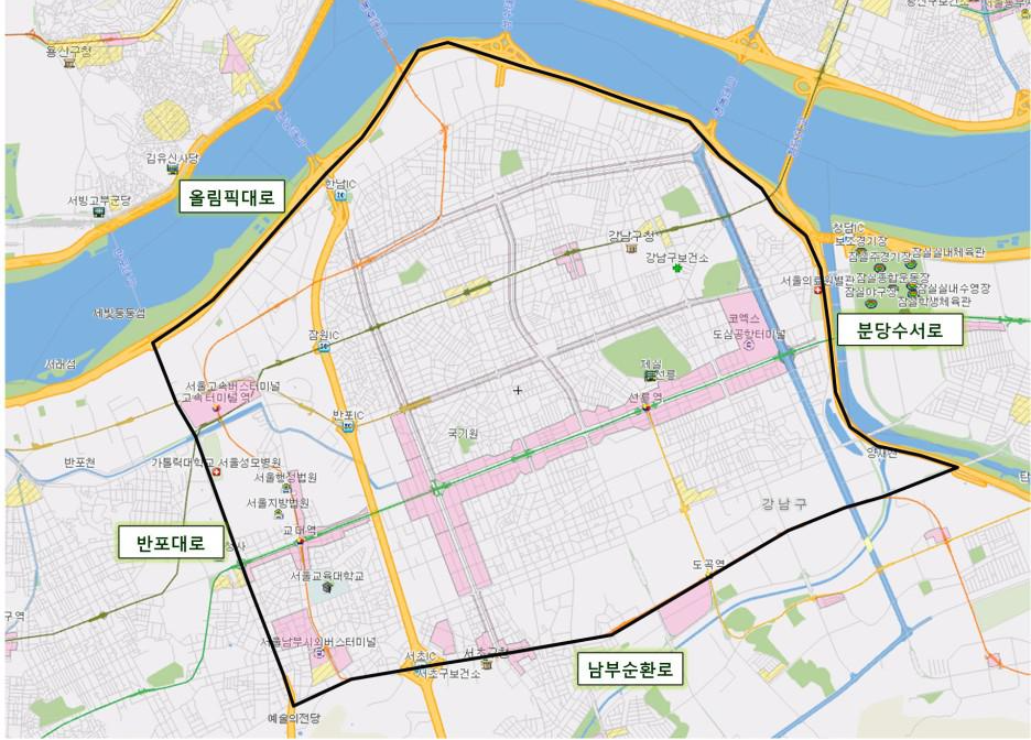 라. 강남·서초지역: 반포대로·올림픽대로·분당수서로·남부순환로를 연결한 내부지역과 그 경계도로에 직접 접하고 있는 대지