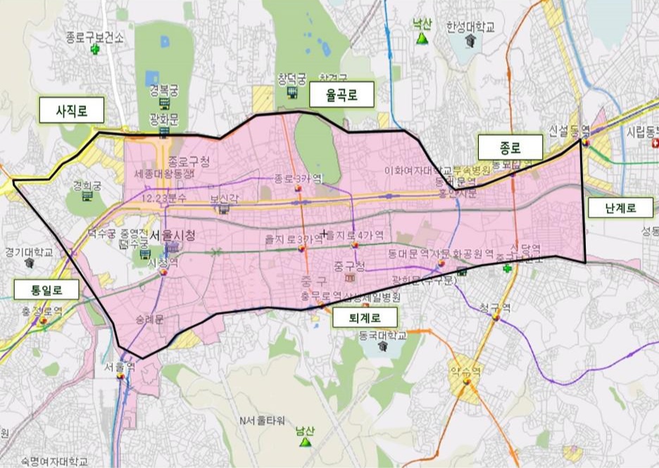 가. 4대문 주변지역: 사직로·율곡로·종로·난계로·퇴계로·통일로를 연결한 내부지역과 그 경계도로에 직접 접하고 있는 대지