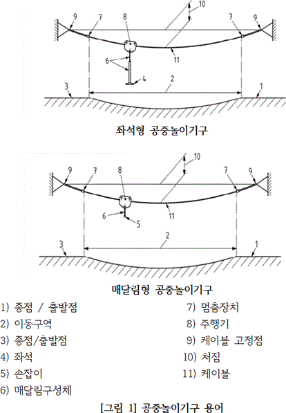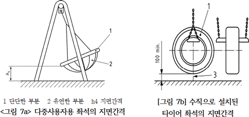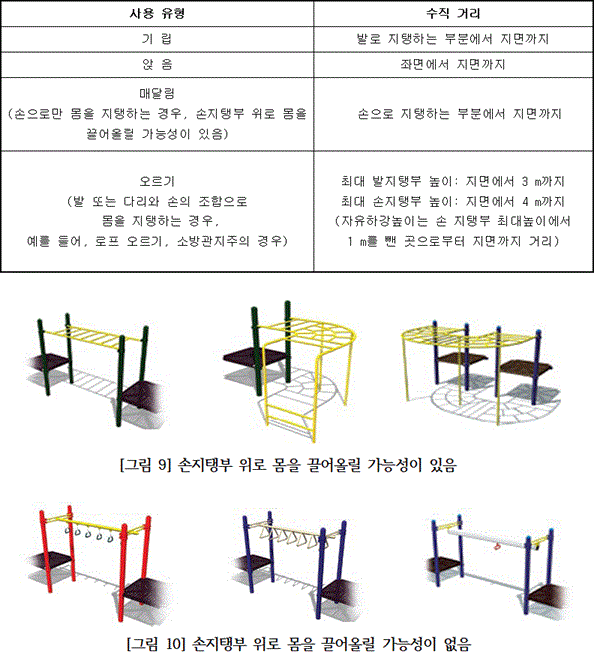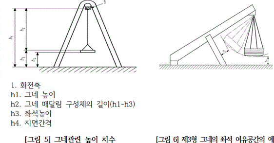 비고 4 : 놀이기구 자체의 움직임이 크거나, 놀이기구의 특성에 의해 사용자에게 강제적인 움직임이 발생하는 그네, 미끄럼틀, 공중놀이기구, 회전놀이기구, 흔들놀이기구 등과 같은 개별 놀이기구에 대해서는 추가 안전요건에 관한 규정을 Ⅱ~Ⅸ에서 제시하고 있다.