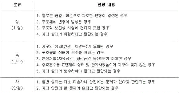 비고 6 : 「어린이놀이시설 안전관리법」시행 전에 설치된 놀이시설에 대해서는 본 설치검사기준에서 제시하는 항목 이외에, 정기시설검사기준 중 10. 놀이시설별 추가검사 항목에 대해 검사를 받아야 한다.