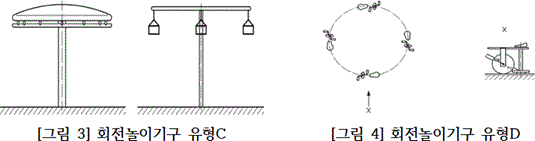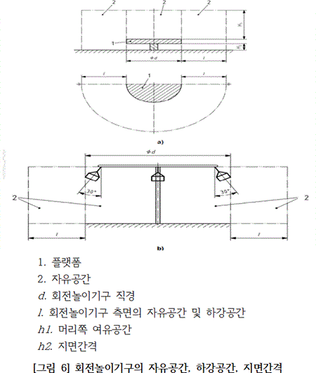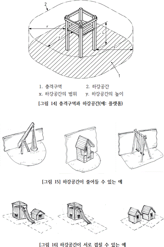 놀이기구 사이에 하강공간의 겹침이 있을 수 있으나, 강제적 움직임이 존재하는 그네, 회전놀이기구, 공중놀이기구에서는 하강공간의 겹침은 발생하지 않아야 한다(그림 16, 17 참조).