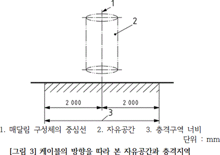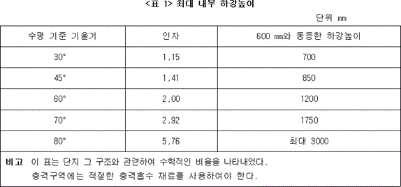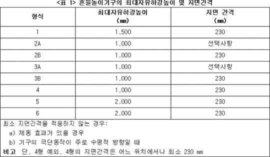 비고 2 : 600 mm 미만의 최대자유하강높이를 갖는 기구의 충격구역은 최소 1000 mm 이상을 적용하며, 자유하강높이가 발생하지 않는 기구에 대해서는 충격구역을 적용하지 않는다.