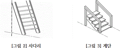 3.8 사다리(ladder) : 사용자가 손을 사용하여 오르내리기 용이한 가로대 혹은 디딤판으로 구성·제작된 접근수단 (그림 2 참조)