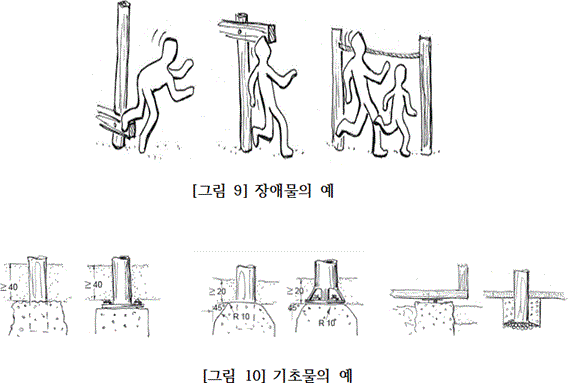 3.13 울타리(barrier) : 사용자가 밑으로 낙하하는 것을 방지하기 위한 것으로, 울타리 아래쪽을 통과하는 것이 불가능한 형태임 (그림 5 참조)