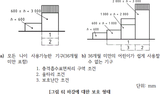 [그림 6]은 기구의 높이에 따른 적절한 보호 형태를 명시하고 있다. 난간, 보호난간 또는 울타리를 경사로나 계단에 설치 할 때는 경사로나 계단의 가장 낮은 위치에서부터 설치되어야 한다.