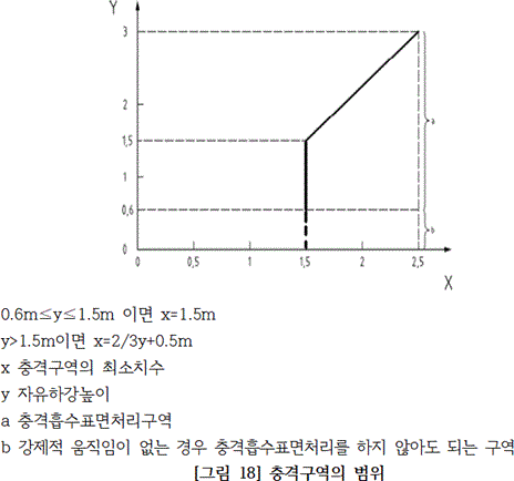 충격구역의 치수는 [그림 18]에 명시되어 있다. 자유하강높이가 1500 mm 미만일 경우 충격구역의 범위는 최소 1500 mm이며, 자유하강높이가 증가할수록 충격구역의 범위도 넓어진다. 단, 울타리 높이가 1500 mm 이상 설치된 부분에는 적용하지 않는다.