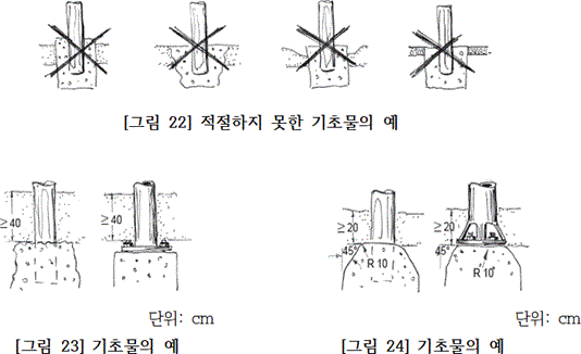 4.4.1.5 놀이기구의 기둥 기초부(몸체 등)등은 충격흡수용 표면재 외부로 노출되지 않아야 하며 고정 상태는 견고하여야 한다.
