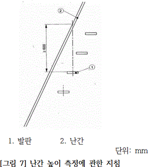 난간의 높이는 발판에서 측정하였을 때 600 mm 이상, 850 mm 이하이어야 한다(그림 7 참조).