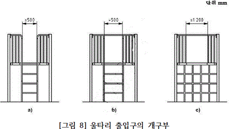 4.1.4.1 울타리 출입구 : 울타리에 있는 출입구의 너비는 어느 지점에서든지 수평으로 측정 시 500 mm를 초과해서는 안 되며, 만약 울타리 사이에 보호난간이 개구부를 가로질러 설치가 된다면 [그림 8]의 b와 c를 따른다. 보호난간이 있는 울타리의 개구부 너비는 1200 mm를 초과해서는 안 된다.(그림 8의 c 참조)