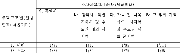 1. 주택단지에는 주택의 전용면적의 합계를 기준으로 하여 다음 표에서 정하는 면적당 대수의 비율로 산정한 주차대수 이상의 주차장을 설치하되, 세대당 주차대수가 1대(세대당 전용면적이 60제곱미터 이하인 경우에는 0.7대)이상이 되도록 해야 한다. 다만, 지역별 차량보유율 등을 고려하여 설치기준의 5분의 1(세대당 전용면적이 60제곱미터 이하인 경우에는 2분의 1)의 범위에서 특별시ㆍ광역시ㆍ특별자치시ㆍ특별자치도ㆍ시ㆍ군 또는 자치구의 조례로 강화하여 정할 수 있다.