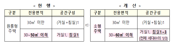 ㅇ 이에 ‘원룸형주택’을 ‘소형주택’으로 용어를 변경하고, 소형주택의 세대별 주거전용면적 상한을 일반 소형 아파트 수준인 60제곱미터* 이하로 확대한다.