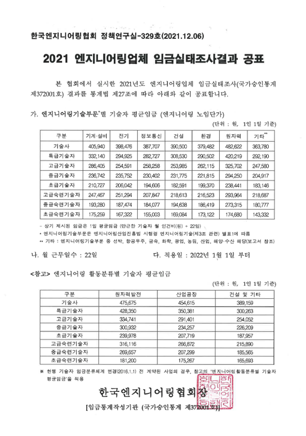 1. 한국엔지니어링 협회에서 공표하는 임금실태조사결과 인용