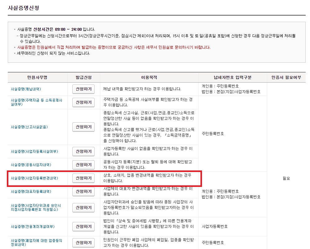 b) 사실증명(사업자등록변경내역)_홈텍스 발급가능