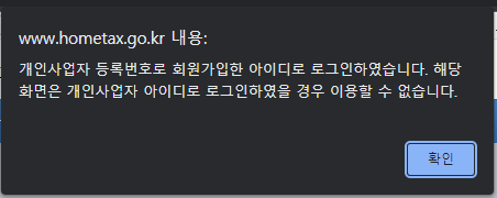 "개인사업자 등록번호로 회원가입한 아이디로 로그인하였습니다. 해당 화면은 개인사업자 아이디로 로그인하였을 경우 이용할 수 없습니다."