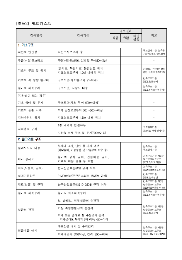 | 검사항목 | 검사기준 | 검토결과 | 비고 | ||