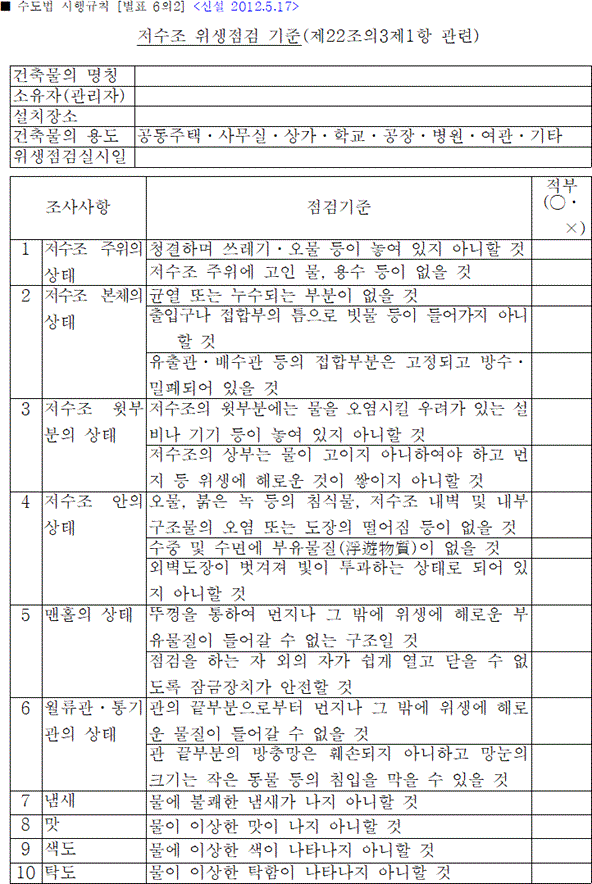 저수조청소 대상 및 조치 기준 요약 1. 대상 : 아래에 해당하는 소유자 또는 관리자 a) 연면적이 5,000㎡ 이상인 건축물이나 시설 (건축물 또는 시설 안의 주차장 면적은 제외) b) 연면적 2,000㎡