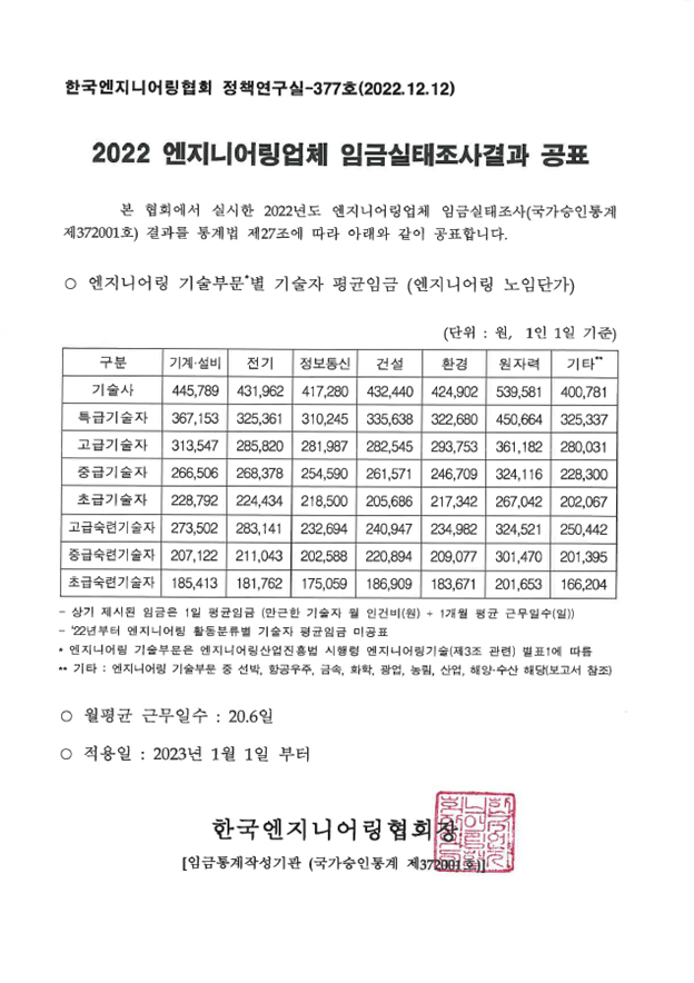 1. 한국엔지니어링 협회에서 공표하는 임금실태조사결과 인용