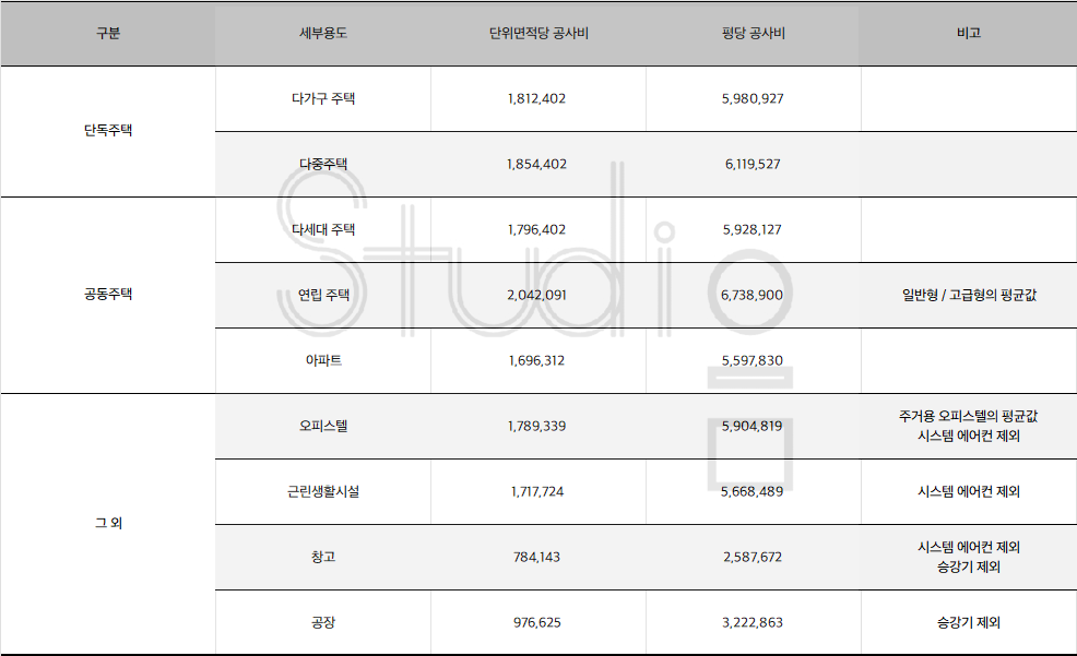 | 구분 | 세부용도 | 단위면적당 공사비 | 평당 공사비 | 비고 |