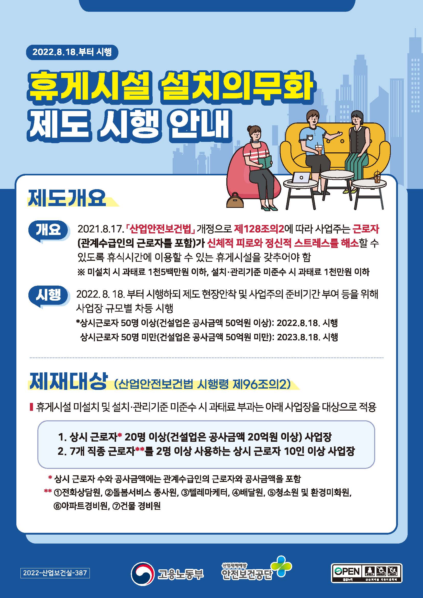 제128조의2(휴게시설의 설치) ① 사업주는 근로자(관계수급인의 근로자를 포함한다. 이하 이 조에서 같다)가 신체적 피로와 정신적 스트레스를 해소할 수 있도록 휴식시간에 이용할 수 있는 휴게시설을 갖추어야 한다.