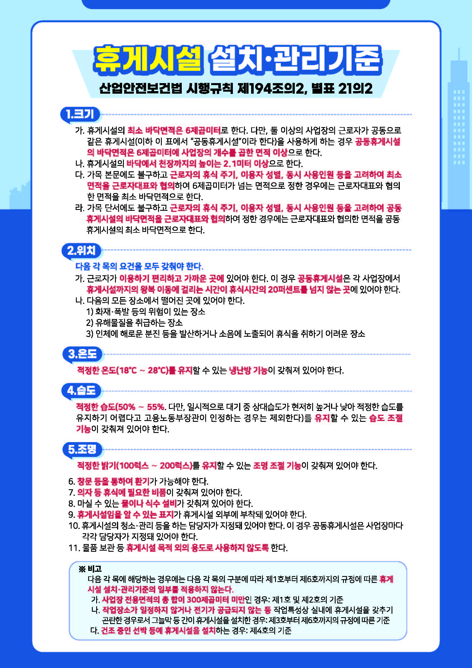 ② 사업주 중 사업의 종류 및 사업장의 상시 근로자 수 등 대통령령으로 정하는 기준에 해당하는 사업장의 사업주는 제1항에 따라 휴게시설을 갖추는 경우 크기, 위치, 온도, 조명 등 고용노동부령으로 정하는 설치ㆍ관리기준을 준수하여야 한다.