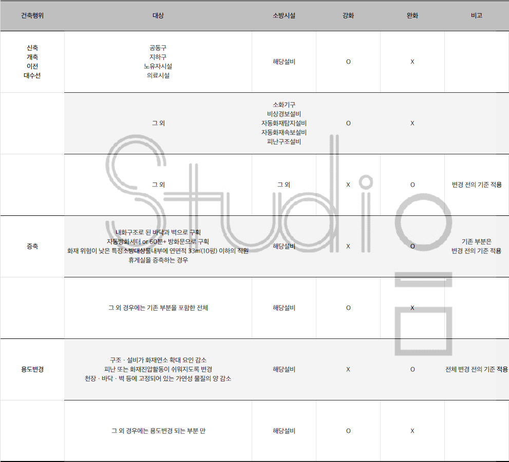 특정소방대상물 건축허가 등 소방시설 동의대상물 범위 바로가기 간이 스프링클러 설치 대상 바로가기 스프링클러 설치 대상 바로가기 특정소방대상물 수용인원 산정 방법 바로가기 https://studi