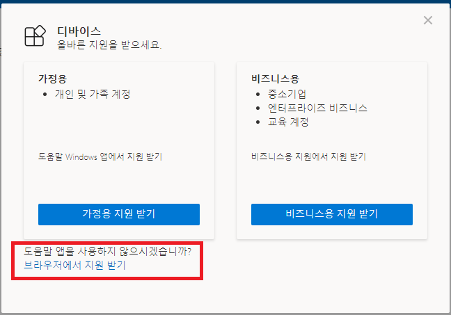 3. 화면의 하단의 ‘브라우저에서 지원 받기’ 항목을 선택합니다.