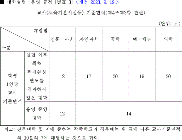 비고: 전문대학 및 이에 준하는 각종학교의 경우에는 위 표에 따른 교사기준면적의 10분의 7에 해당하는 것으로 한다.