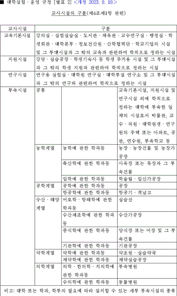 | 교육기본시설 | 강의실ㆍ실험실습실ㆍ도서관ㆍ체육관ㆍ교수연구실ㆍ행정실ㆍ학생회관ㆍ대학본부ㆍ정보전산원ㆍ산학협력단ㆍ학교기업의 시설 및 그 부대시설과 그 밖의 교육과 관련하여 학칙으로 정하는 시설 | ||
