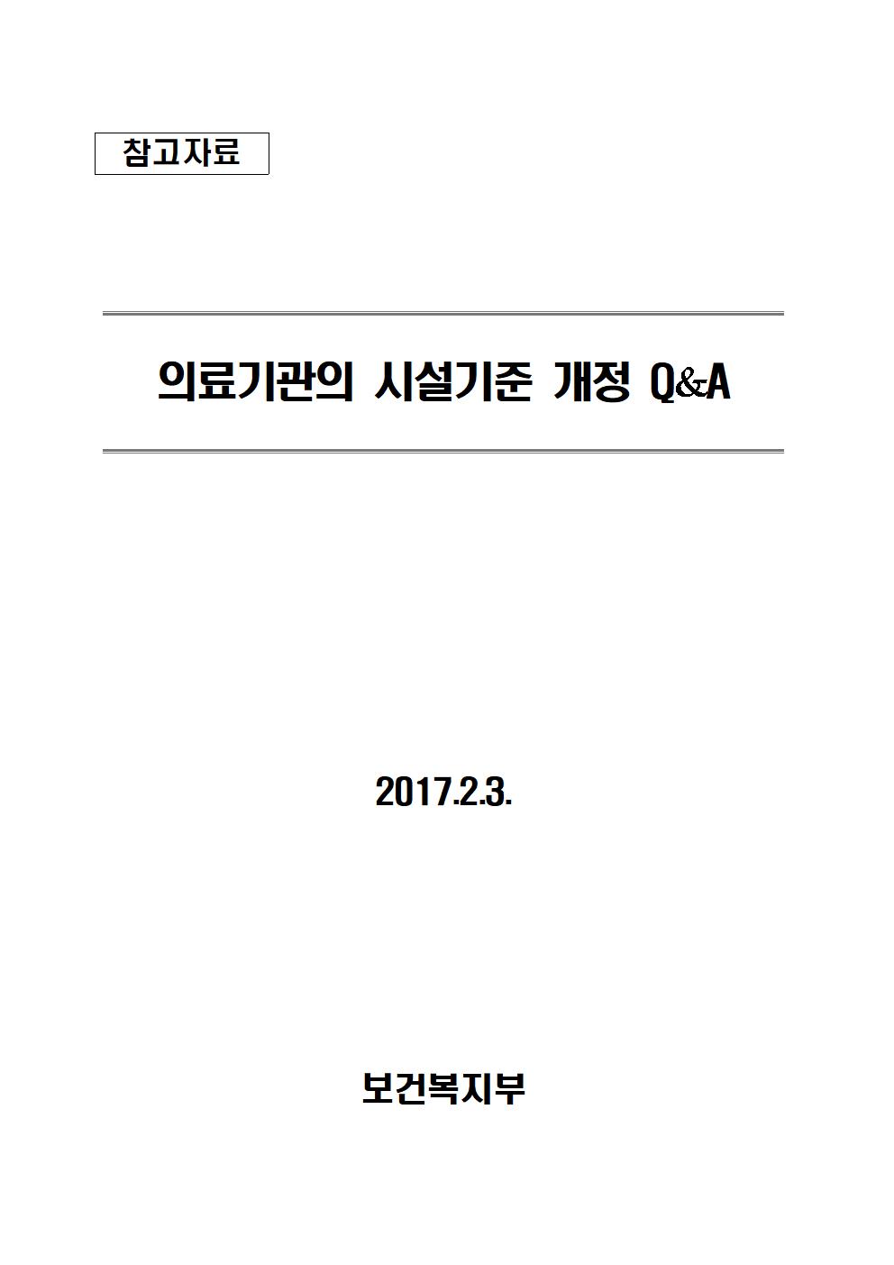 | A3. 환자진료와 관련된 입원실 및 중환자실을 신축, 증축, 개축, 재축 또는 대수선하여「건축법」에 따른 건축신고 또는 건축허가를 받아 시설공사를 하여 입원실 및 중환자실의 공간으로 활용하는 경우 개정된 규정을 적용합니다. 그 이외의 특수병실 및 기타시설(행정실, 검사실 등)의 시설·용도변경을 위한 건축허가의 경우에는 제외됩니다. |