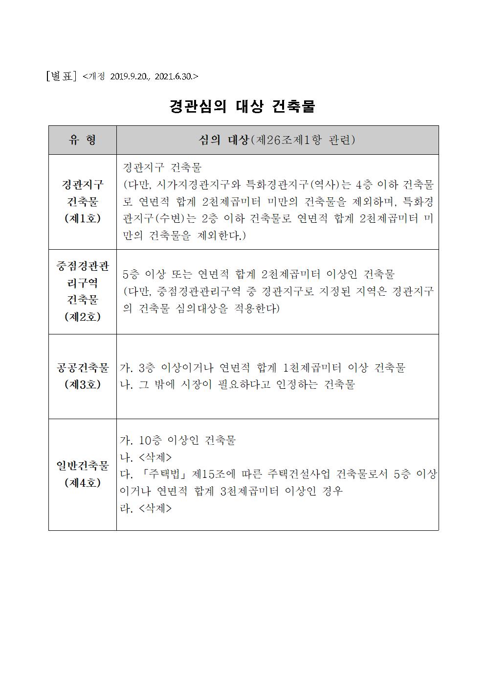 경관지구 건축물 (다만, 시가지경관지구와 특화경관지구(역사)는 4층 이하 건축물로 연면적 합계 2천제곱미터 미만의 건축물을 제외하며, 특화경관지구(수변)는 2층 이하 건축물로 연면적 합계 2천제곱미터 미만의 건축물을 제외한다.) |